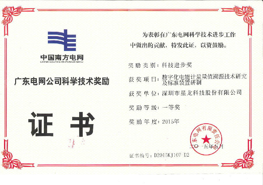 喜讯!继星龙科技项目“动态畸变负荷电能准确计量及溯源技术、装备与应用”获得广东电网公司科学技术一等奖之后,公司项目“数字化电能计量量值溯源技术研究及标准装置研制”再次荣获了广东电网公司科学技术奖一等奖。