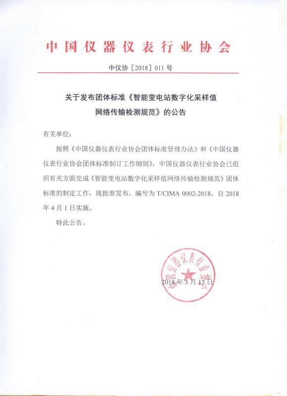 由中国仪器仪表行业协会电工仪器仪表分会提出,中国仪器仪表行业协会归口,国网四川省电力公司计量中心、哈尔滨电工仪表研究所有限公司、深圳市星龙科技股份有限公司(以下简称“公司”)等多家单位参与起草的《智能变电站数字化采样值网络传输检测规范》团体标准(标准编号:T/CIMA 0002-2018)已经中国仪器仪表行业协会批准实施(中仪协[2018]011号)。